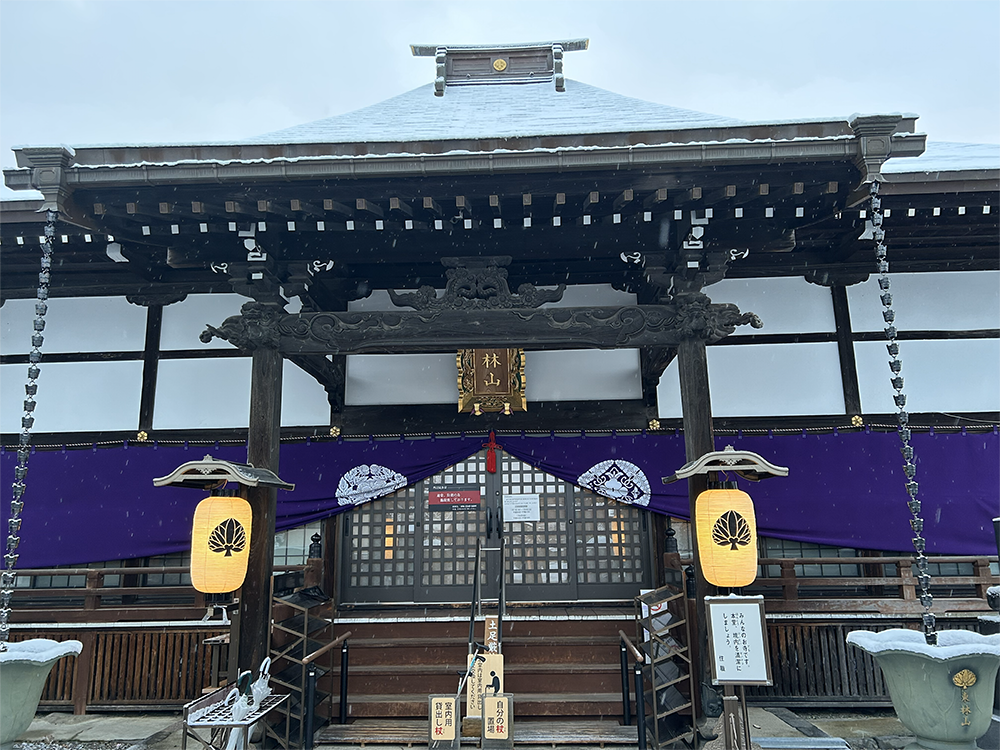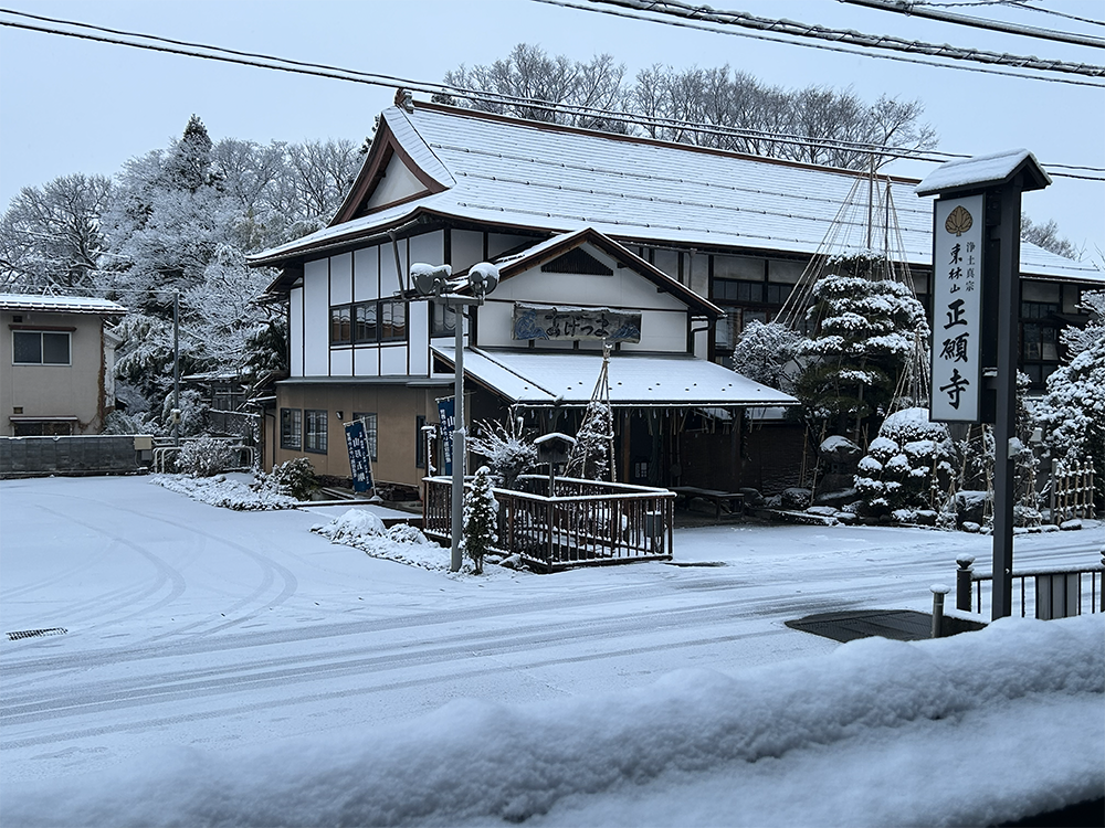 今年は雪が少なく、穏やかな元旦となりましたが、朝には本堂にもうっすらと雪が積もり、向かいの郷土料理「あげつま」さんの屋根も白く雪化粧をしておりました。